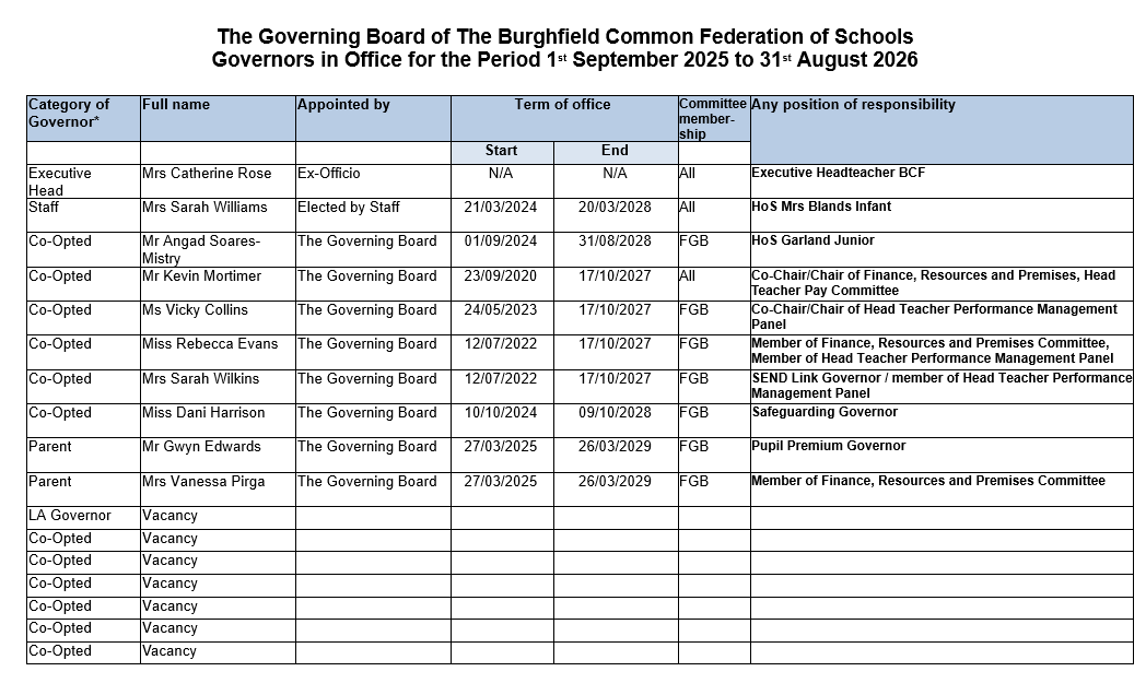 We are immensely proud of our all our governors, who each bring a diversity of knowledge, skills and experience to help in the running of our school and ensure we make best use of all our resources. The tables below show details of our current governing body and the positions they hold. Our governors can be contacted via the school office or you can email them via our clerk at: cclerk@theburghfieldcommonfederation.org