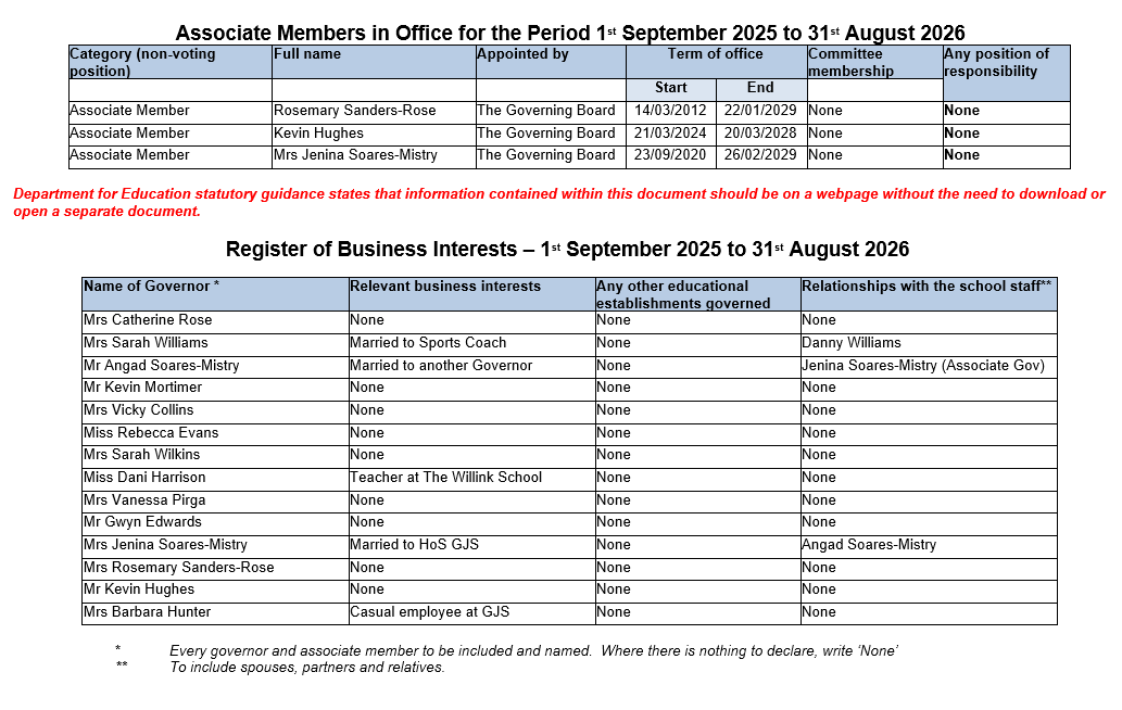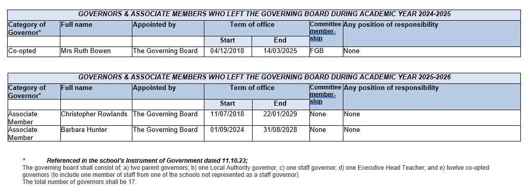 Governors in Office for the Period 1st September 2025 to 31st August 2026